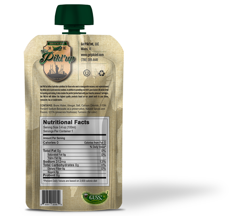 Our products are delivered through a rigorous process that begins with the greatest natural water on earth. Born in the Bronx, Get Pikl’ed brings to the public authentic New York water based pickle brine. Get Pikl’ed offers hydration solutions for those who need a manageable recovery and replenishment for either pre or post exercise routines.